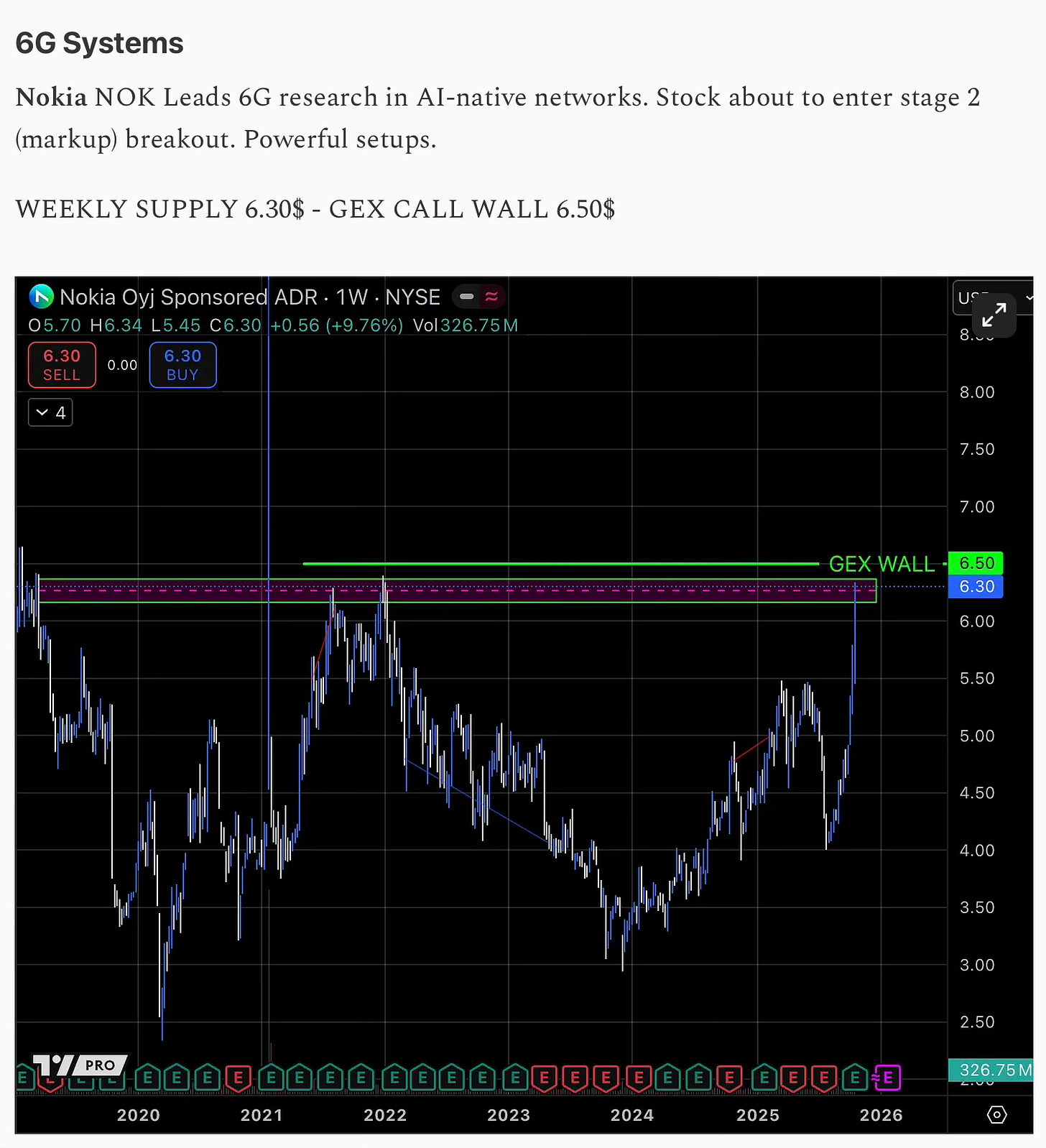 NOK 0.00%↑ our trade idea from Sunday’s letter is up massively, we opened this trade also in our private discord room and posted it as a perfect candidate for a powerful stage 2 breakout. News are that Nvidia is taking 1 billion stake in Nokia and then there’s the 6G - read below screenshot from our post.