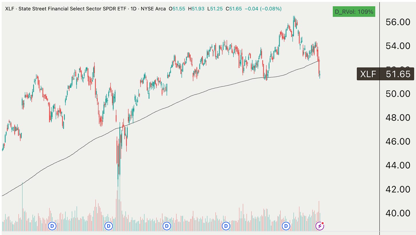 XLF 0.00%↑ FINANCIAL SECTOR ETF broke below its 200 daily moving average, last time this happened was during last year’s drawdown.
