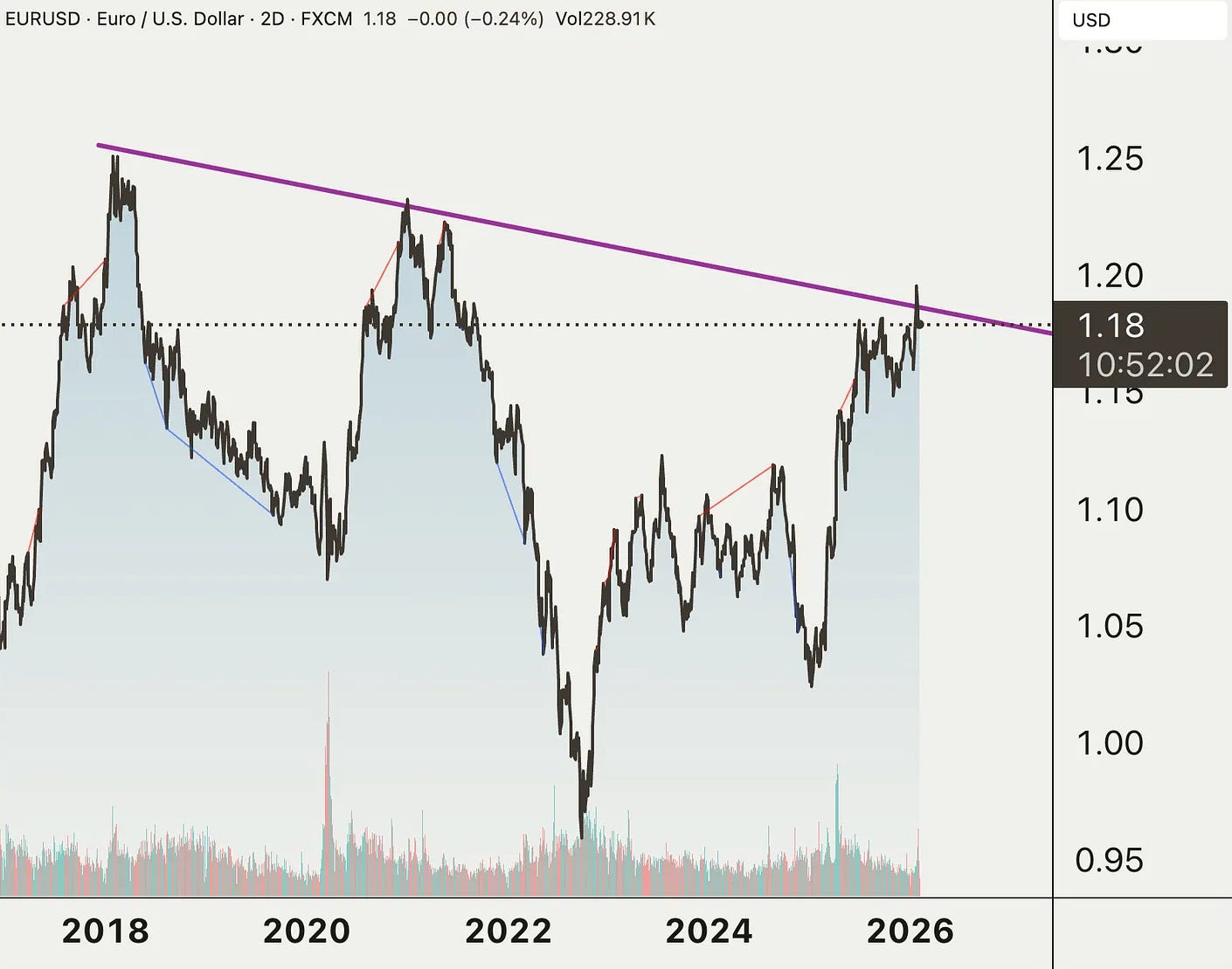 EUR/USD failed at the 1.20 "debasement" level, sparking a messy reversal in metals. Silver is taking the biggest hit, proving once again it's the most high-beta play when FX and rates get volatile.