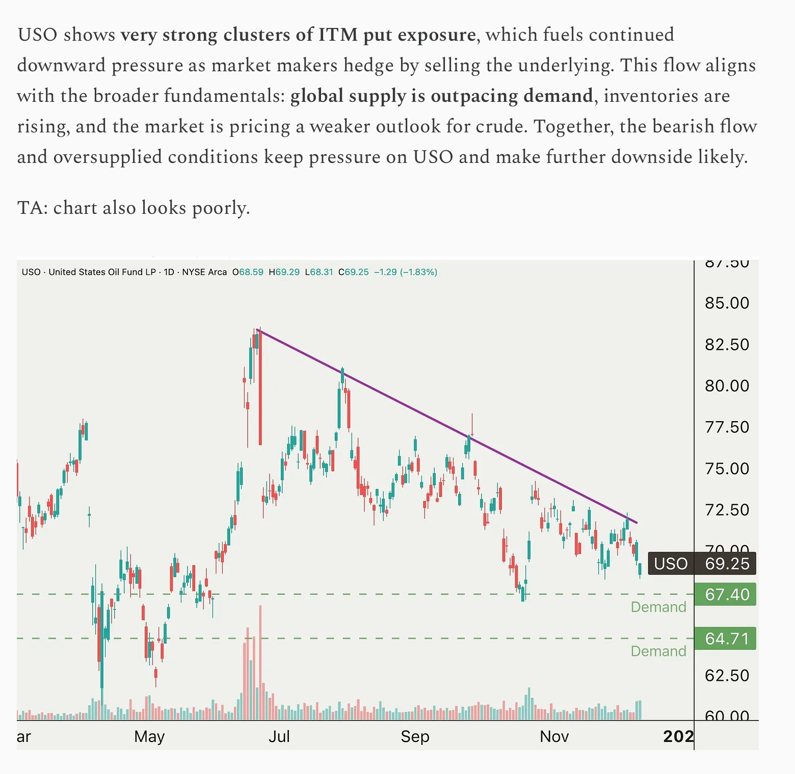 WTI continues to weaken, and this move was anticipated by options positioning well in advance. The build-up of USO ITM put delta and negative dealer exposure signaled growing downside risk, meaning that as price started to fall, hedging flows would accelerate the drawdown rather than absorb it. That’s exactly what we’ve seen.