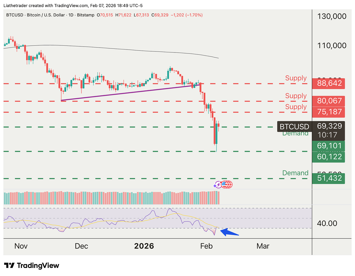 With over $3 billion in liquidations and accelerating ETF outflows, the technical damage is undeniable. However, we shouldn’t be entirely surprised. Back in December, we proposed a key support level around $60k–$65k, and Thursday’s volatile session saw Bitcoin bounce exactly off that range, hitting a low of $60,008.