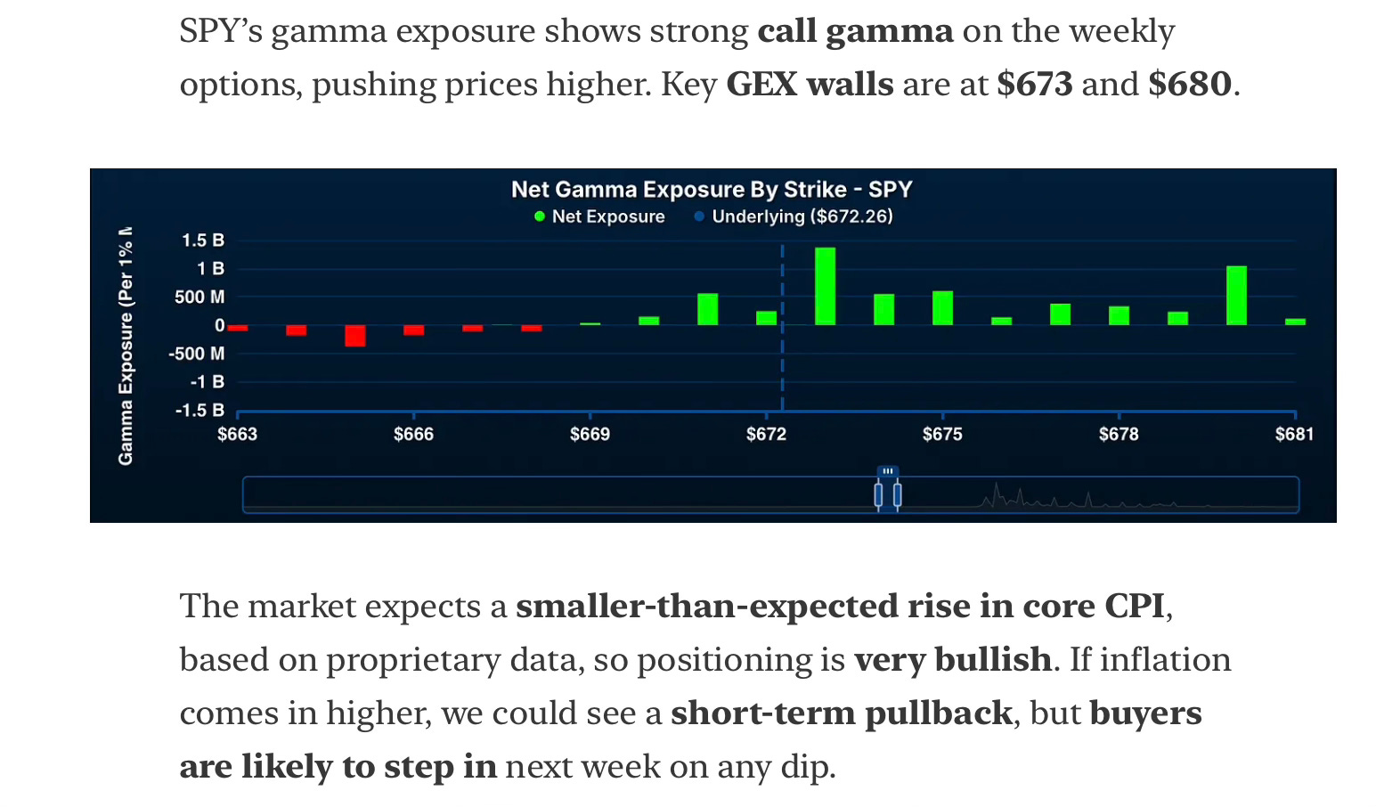 What an exciting day in the markets! As we noted in yesterday’s report (see the screenshot below), the positioning into the CPI was bullish, with strong call gamma on the weekly options up to $673–$680. The SPY closed at $677.25 right in our predicted range. We will share new SPX levels in our Sunday’s report.