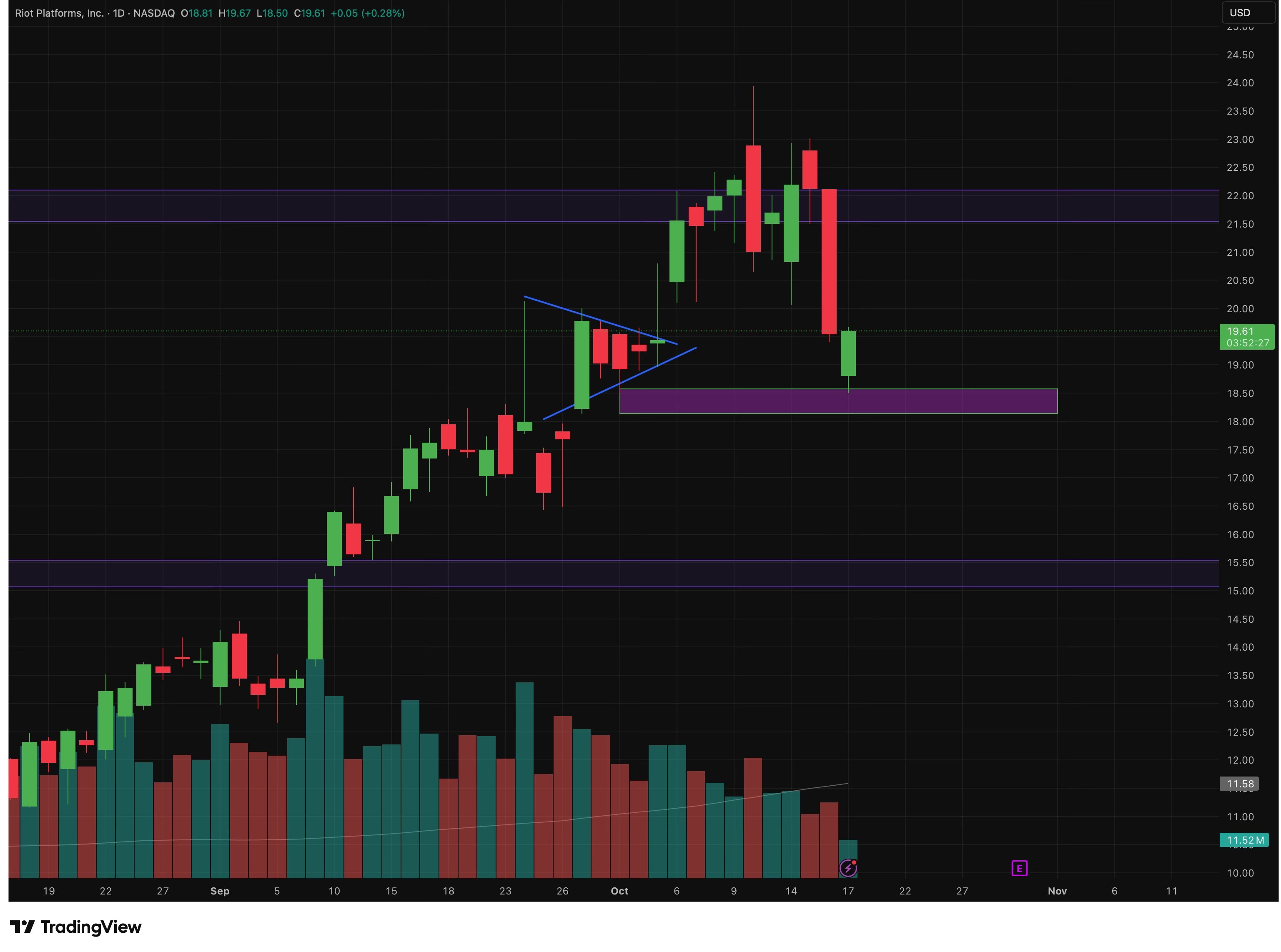 Still has some juice to go and it’s bouncing off od the $19 demand level. If this one breaks we can expect $15-16 level to be the next. Target is $21-$22 which is a strong supply level to break. Once it’s above $22, we see call option increased IV up to $35 level.