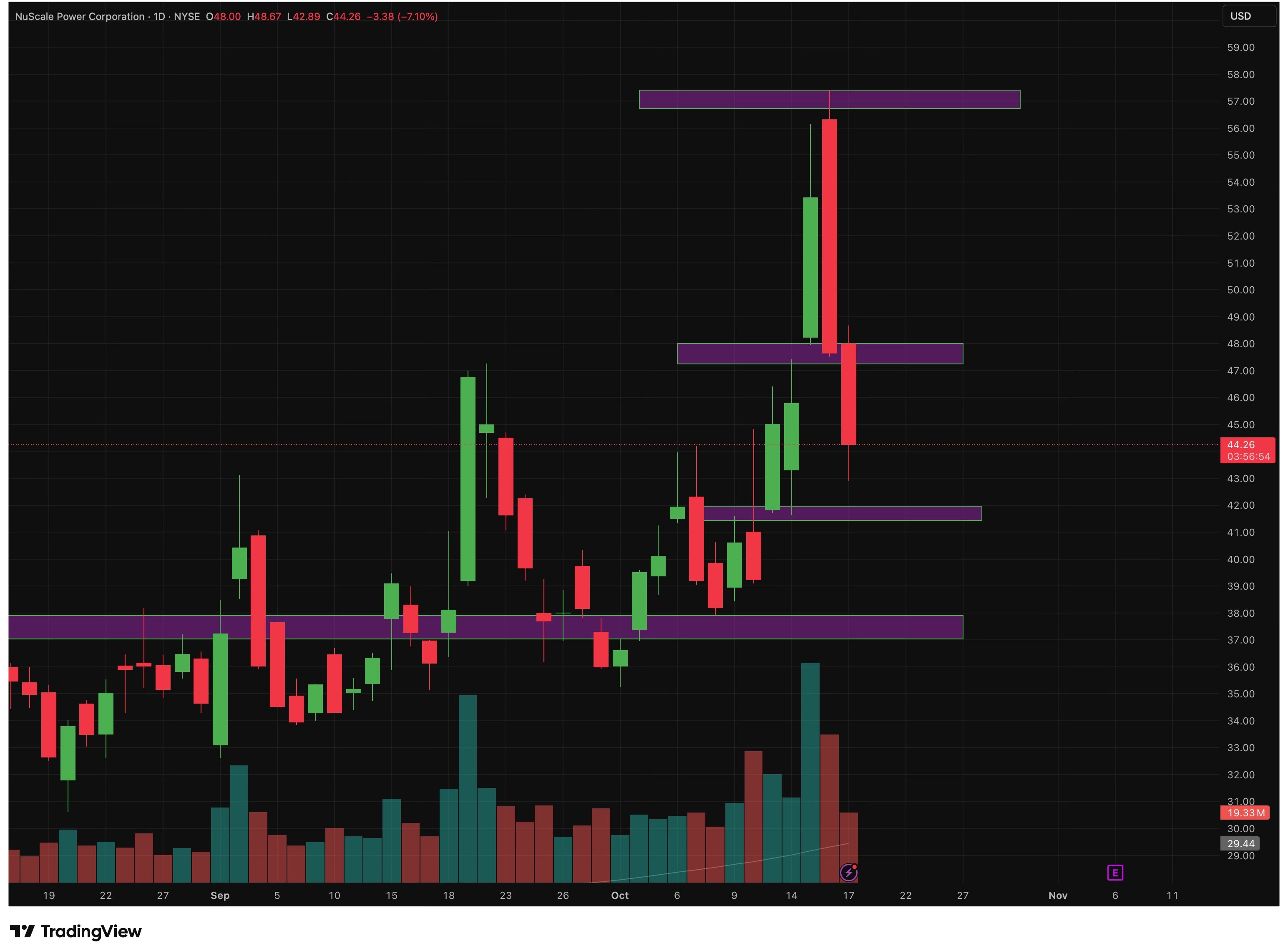 Supply zones around $47-$48 and higher at $57-$58.