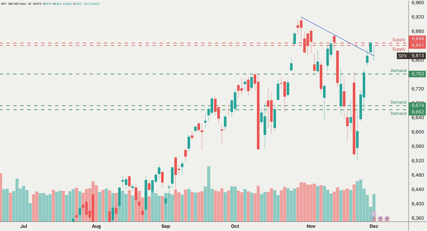 We retested the demand level we posted yesterday, hitting 6,799 before bouncing (our target was 6,794). The market closed with a large indecision candle.