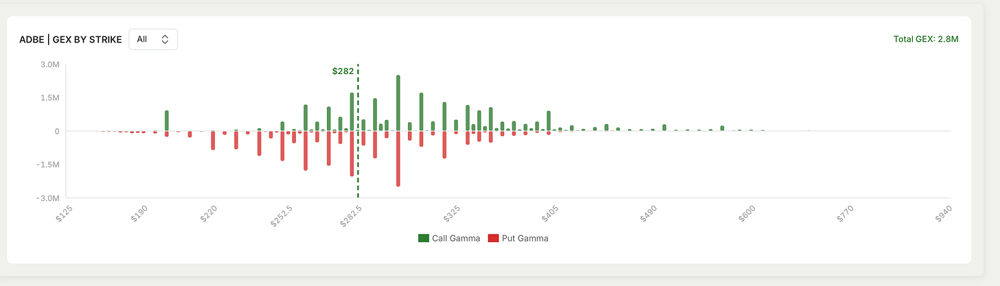 Adobe's stock is currently caught in a tug-of-war. Even though earnings are coming up this Thursday, the options market is looking unusually calm. There’s a huge concentration of bets right at the $300 level, which is creating 'positive gamma.' This basically acts like a shock absorber, where market makers actually help keep the price steady. Expect the stock to 'pin' or hover in its current range as we approach the announcement.