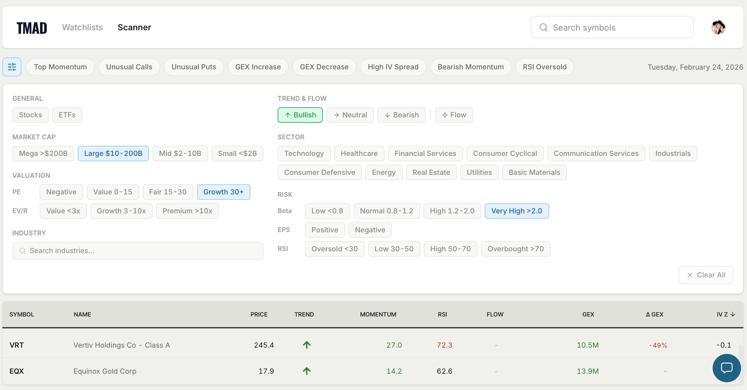 To our momentum scanner we also added general scanner where you can look for names with all the possible criteria + our custom made criteria.