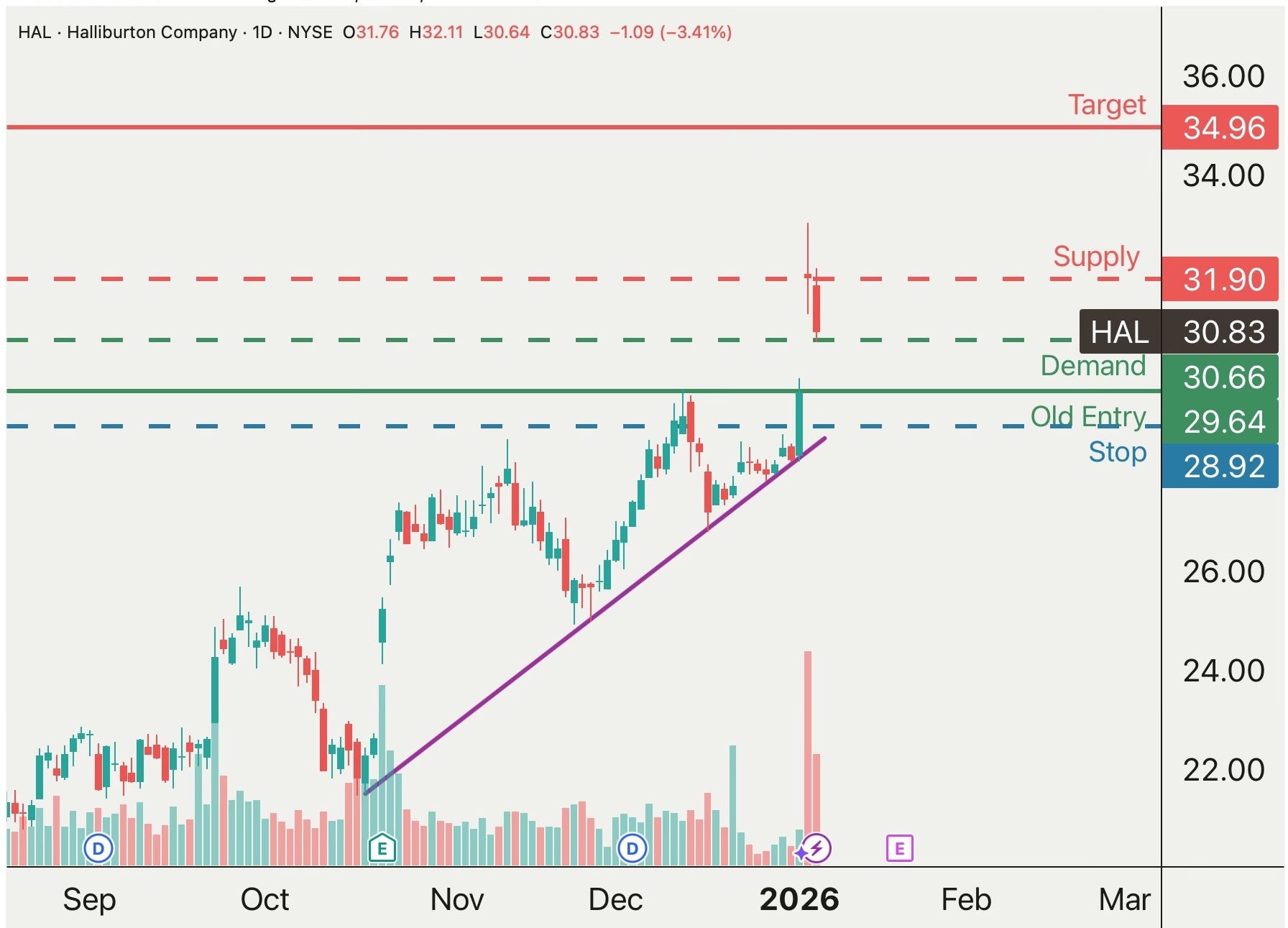 HAL 0.00%↑ is now in a good buying spot on a demand zone, with an entry around $30.66 and a stop loss below the previous low at $28.92. Targets are $35+.