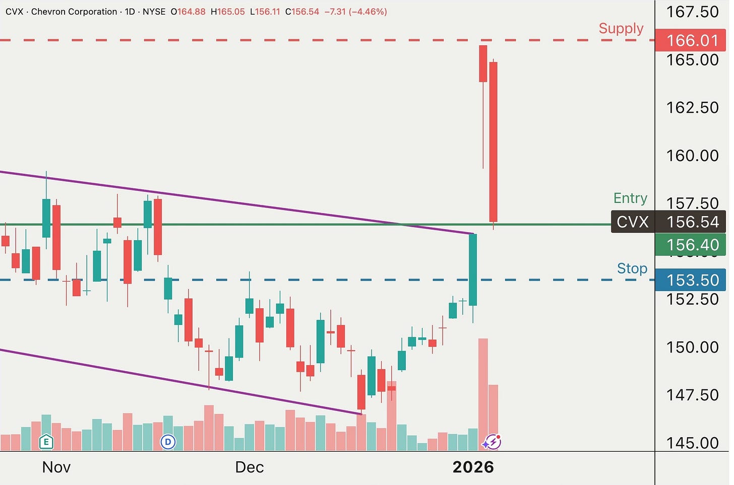 The market was primarily fueled by excitement in the AI and data storage sectors; companies like SanDisk and Western Digital saw massive gains following bullish comments from Nvidia’s CEO. Additionally, investor sentiment was lifted by recent U.S. military actions in Venezuela, which sparked hope for improved global energy supply and stability. While most sectors rose, energy stocks actually dipped as oil prices cooled. XOM and CVX gave back almost all Monday’s move and it’s crucial that they remain above the breakout levels. (See our Sunday’s post). If not, it’s a bad sign and one should rather stay away.
