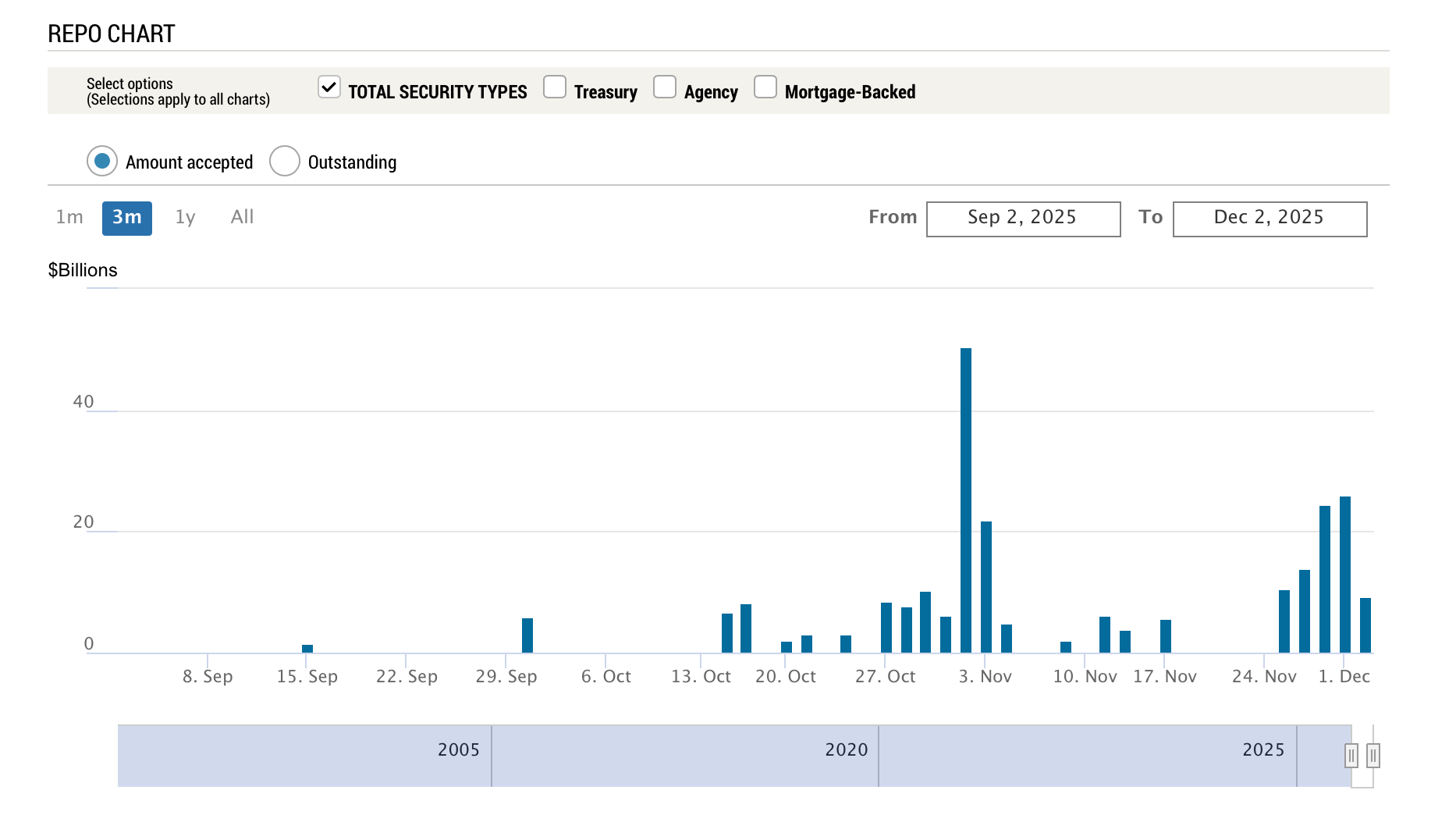 The chart displays the amount of repo liquidity accepted by the Fed over the past 3 months. A few things stand out: