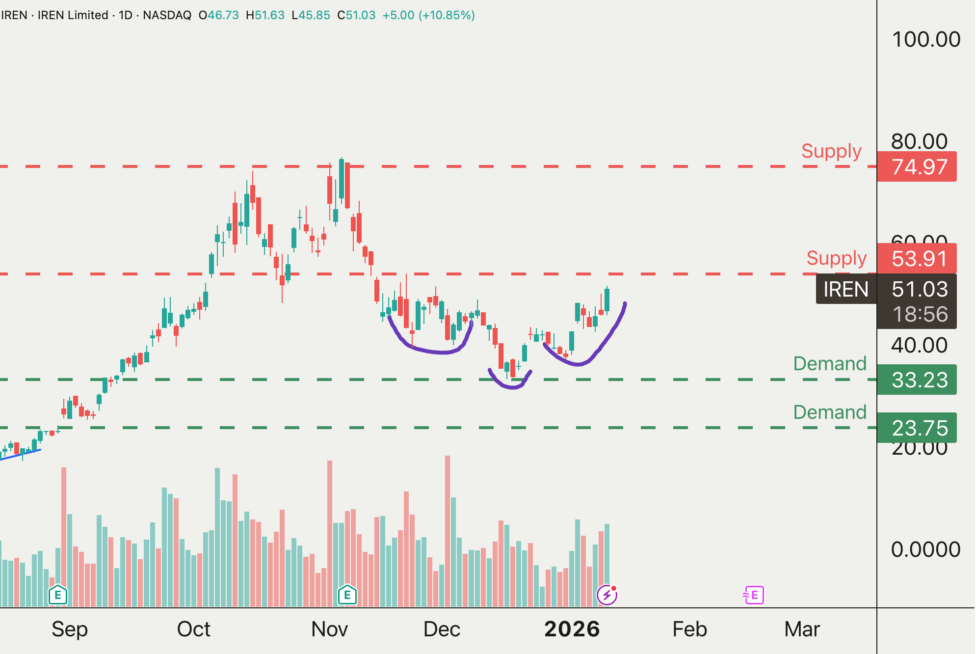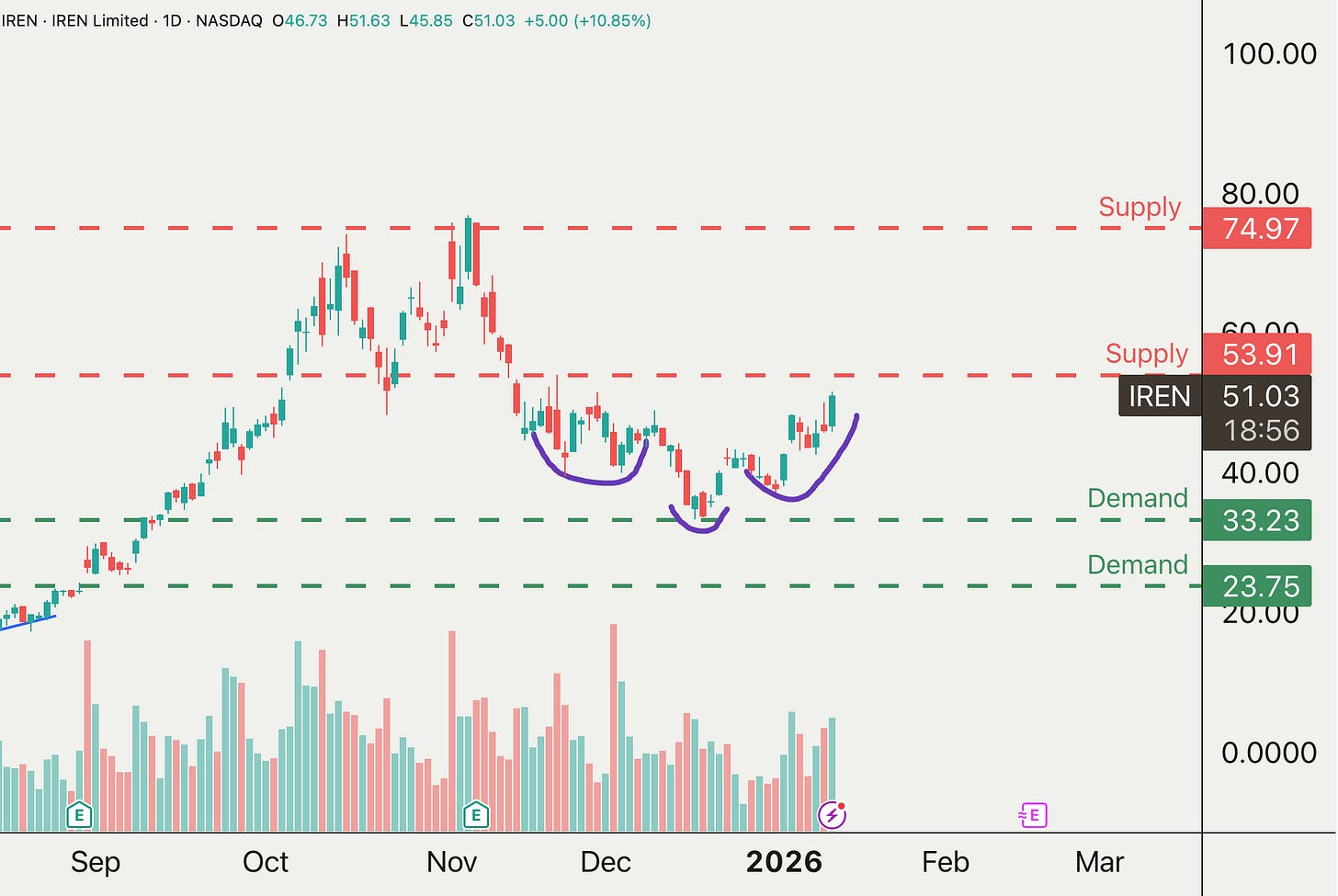 Technical Chart: clear inverse H&S, after a while of bottoming IREN seems to be moving back up. Above $53.90 which is a bit of supplu we can see $70-$75 target.
