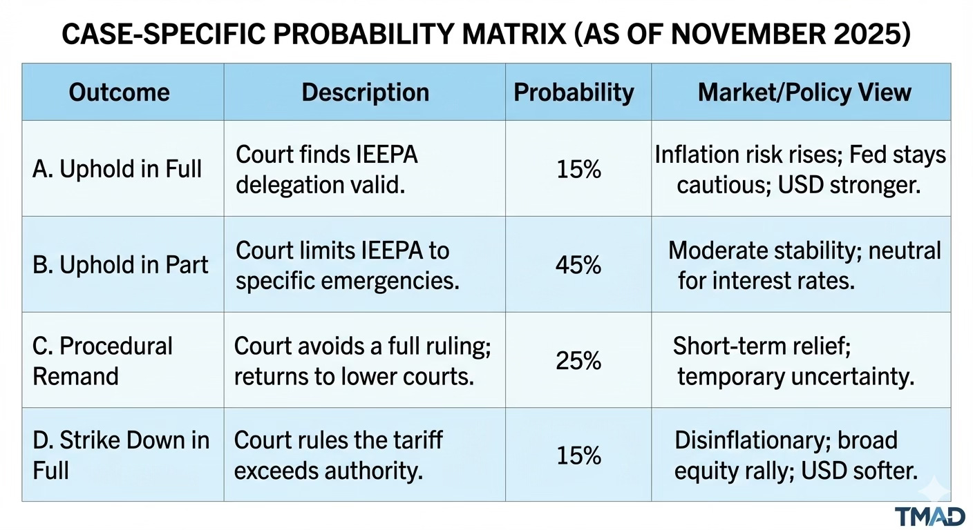 The “Narrow Ruling” (Outcome B) remains the base case. The Court often prefers to avoid sweeping constitutional changes, instead choosing to maintain the statute while significantly narrowing its scope. However, Outcome C (Remand) is a strong wildcard. By returning the case for “clarification,” the Justices could signal limits on executive power without causing an immediate systemic shock.