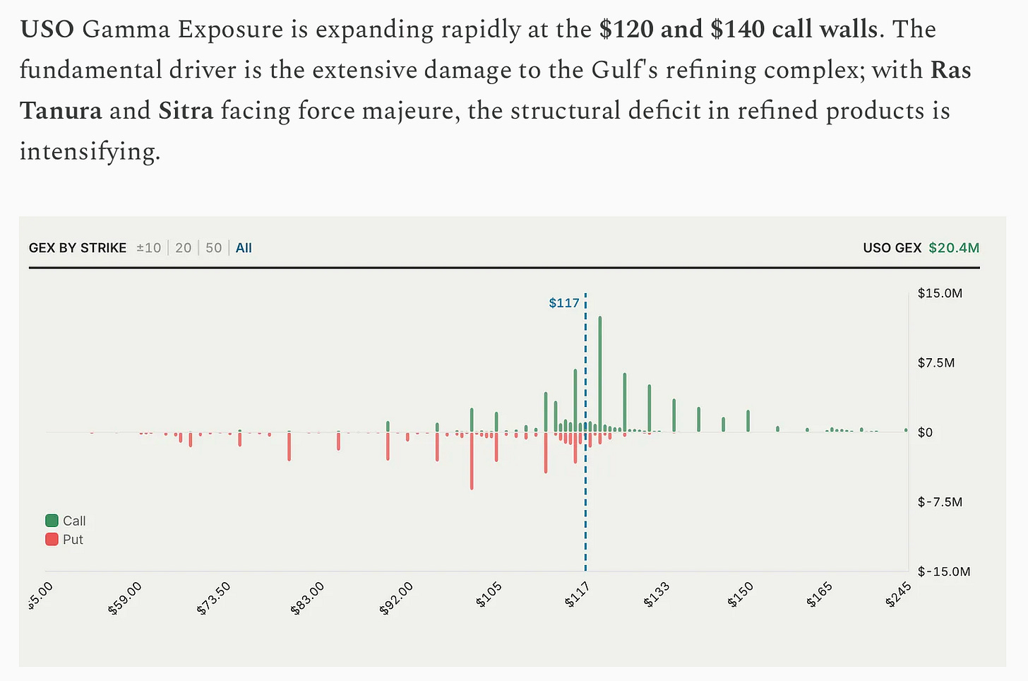 Last week, I pointed out the huge buildup of bets (call gamma) targeting $140 on USO, and today we hit it. The spark was Trump’s prime-time speech from the Oval Office. Any hope for a quick ceasefire vanished after he pledged another 2 to 3 weeks of intense military strikes to finish the job. This dashed the market’s hopes for a short-lived conflict, triggering a massive wave of short-covering in oil futures as traders realized the Strait of Hormuz isn't reopening anytime soon.