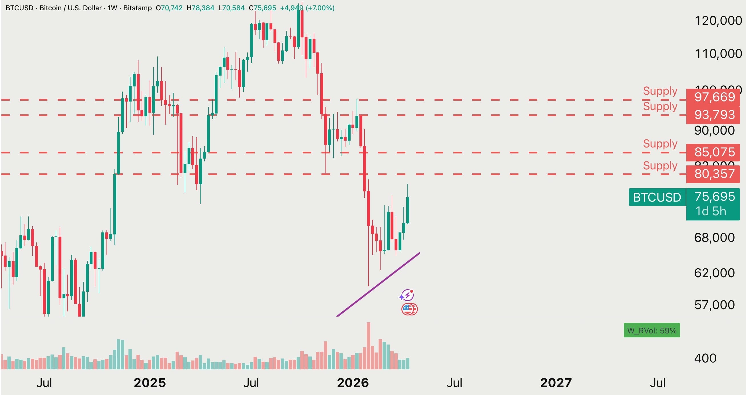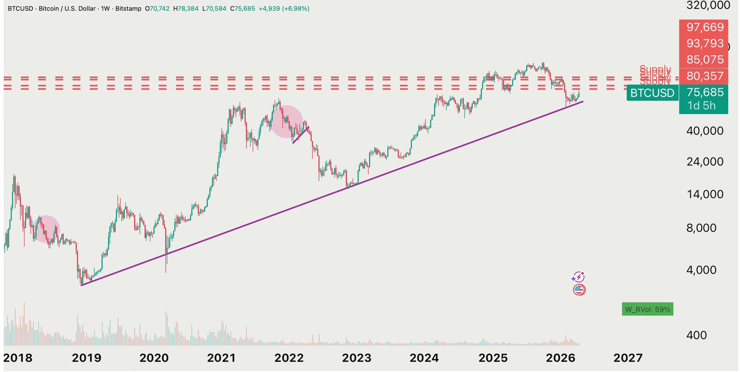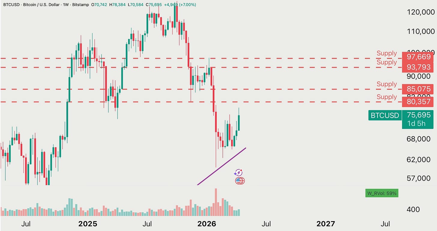 What a week. Bitcoin just delivered one of its cleanest technical bounces of 2026, ripping back roughly 15% from the lows near $68,000 to trade right around $78,300. That move wasn’t random. We bounced from an ascending trendline that connects the December 2018 cycle low, the March 2020 COVID crash, and the December 2022 bear-market bottom. Three major cycle lows. Seven years. One line. And it held again.