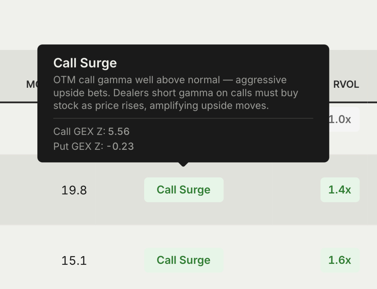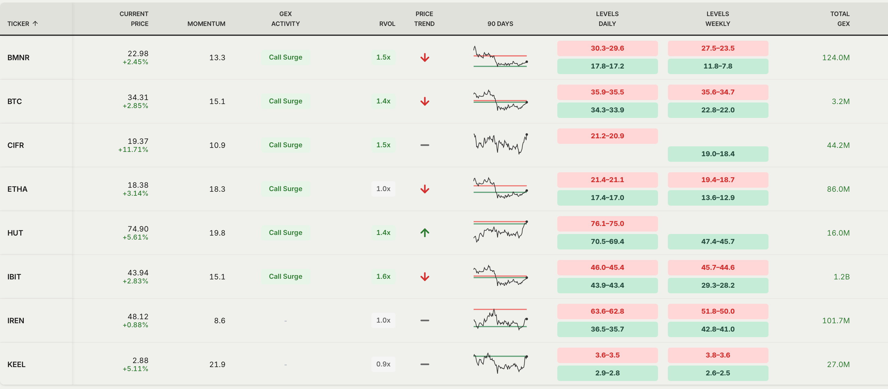 Some names are already in uptrend and some still lagging. Your weekly and daily levels are on here too. Red is resistance and green is support. All have positive gex, all have positive momentum, excellent readings thus far. When you click on each individual ticker, you’ll see which ones are close to resistance and one needs to exercise caution and which ones are bouncing off of support. Most names have call surge, which is a very good sign for long into next month.