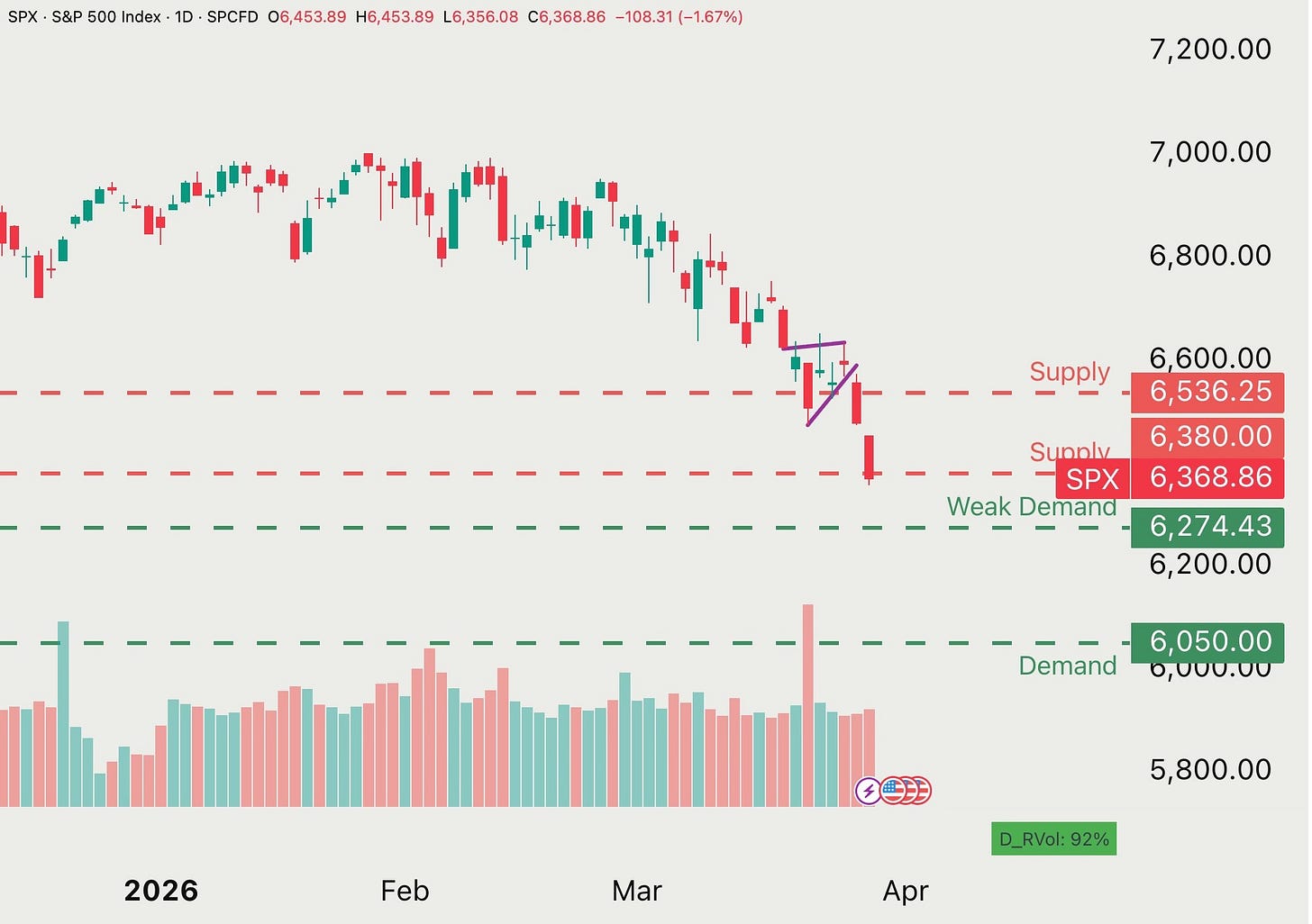 The Line in the Sand: For the bulls to reclaim the narrative, the market needs to claw back above the 50-weekly moving average, which sits around 6472 and the supply level at 6,536.